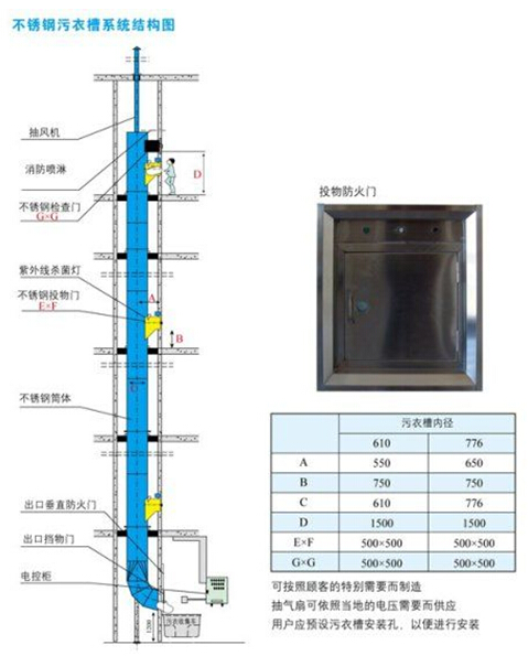 污衣井是采用進口優(yōu)質(zhì)不銹鋼加工焊接而成。槽管以角形圓環(huán)接口結(jié)合,允許各層樓的槽管在高度上的尺寸和冷縮熱脹的情況。在每一層樓,槽管以鍍鋅鐵地臺固定架支承,并用螺栓錨固于地臺上。污衣井在所需的樓層提供的投物門為側(cè)鉸、雙層門,可以加配電控門鎖,也可以人手操作。