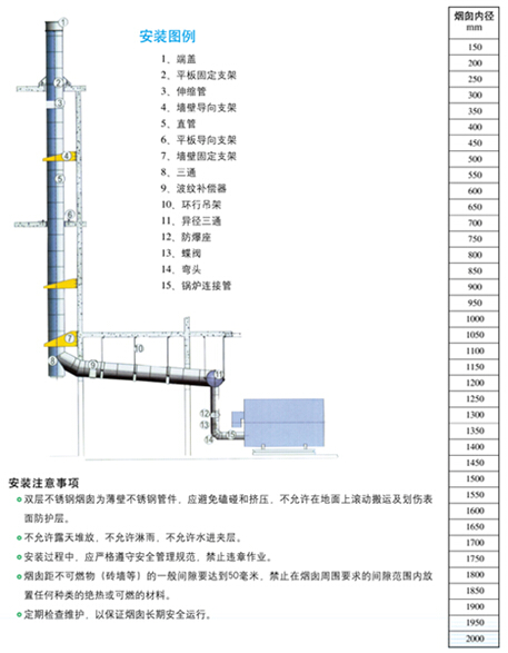 煙囪每個部件的內、外筒及隔熱材料出廠前組裝為一體,現場安裝時,只需擰緊螺釘即可,無須現場焊接、鉚接,使安裝方便、快捷。